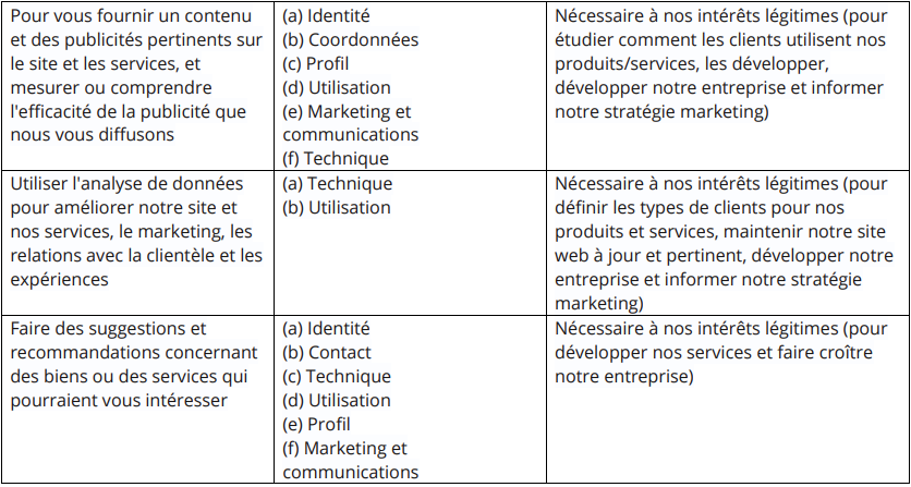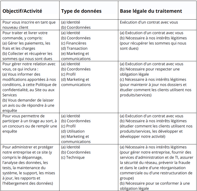 Notez que nous pouvons traiter vos données personnelles pour plus d’un motif légal, en fonction du but spécifique pour lequel nous utilisons vos données. Veuillez nous contacter si vous avez besoin de détails sur la base légale spécifique sur laquelle nous nous appuyons pour traiter vos données personnelles lorsque plus d’une base est indiquée dans le tableau ci-dessous.
